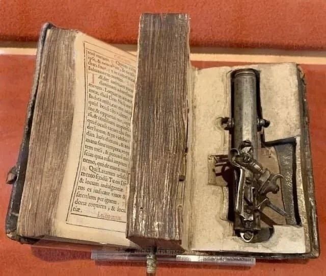 Просто. Пистолет, спрятанный в Библии, сделанный для Франческо Морозини, дожа (главы) Венеции (1619–1694). Владелец Библии мог потянуть за шелковую закладку и выстрелить, когда книга еще закрыта. Сейчас экспонируется в Музее Коррера в Венеции.