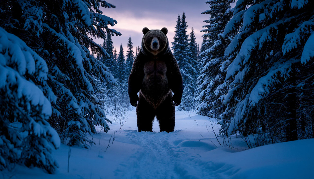 Огромный, бурый, шкура местами вытерта до проплешин, вся в комьях смёрзшегося снега и хвои. Он стоял на задних лапах, неестественно прямо, как солдат в строю. Передние лапы были опущены вдоль туловища, и пальцы на них... они казались слишком длинными, суставчатыми, больше похожими на корявые человеческие руки в меховых перчатках, чем на медвежьи лапы.