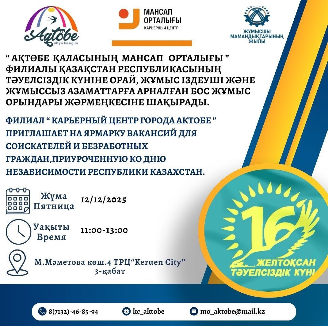 📌12 декабря 2025 года с 11.00 до 13.00 управление координации занятости и социальных программ и Карьерный центр города Актобе приглашают на ярмарку вакансий для соискателей и безработных граждан, приуроченную ко Дню Независимости Республики Казахстан. 🌐Адрес: ТРЦ “Keruen City”, 3 этаж