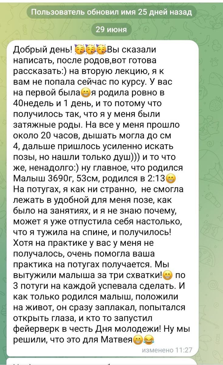 Рассказ от Лены на скринах. Выкладываю с её разрешения. Лена ходила на мои вторники — милая, внимательная, включённая байкерша 😜. Планировала партнёрские роды с мамой, думала об индивидуальной подготовке... А потом я уехала, а её животик упрямо рос! 💫 Вернулась — а Лена тут как тут: на занятии в почти 40 недель, с огоньком в глазах и вопросом: «А если рожу прямо сейчас?». Роды чаще всего не совпадают с представленной картинкой: • На практике: ей идеально тужиться на боку, а на спине — «нет-нет»! • В реальности: потуги захотелось проживать на спине — и это СРАБОТАЛО БЛЕСТЯЩЕ! ✨ (Да, мы часто критикуем позу «лёжа», но Лена показала: главное — слушать тело!). НЮАНСЫ: 🔥 Дыхание: помогало лишь до 4 см. А дальше? Я заметила, что дальше бывает важен голос рядом: «Дыши со мной! Выдыхай длиннее!». Не все могут дышать «по учебнику» — иногда нужен живой проводник. 🔥 «Огненное кольцо»: Лена его не чувствовала! И это тоже норма. 🔥 Сон между схватками: Лена засыпала! Это уровень дзен-масте