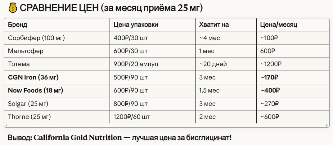 🏪 КОНКРЕТНЫЕ БРЕНДЫ И ОЦЕНКИ РОССИЙСКИЕ АПТЕКИ Сорбифер Дурулес (Венгрия) Форма: Сульфат 100 мг Плюсы: Дёшево, есть везде Минусы: Побочки Цена: ~400₽ за 30 таблеток Вердикт: 3/10 Мальтофер (Швейцария) Форма: Полимальтозный комплекс Плюсы: Мягкий, безопасный Минусы: Медленно работает Цена: ~600₽ за 30 жевательных таблеток Вердикт: 7/10 Тотема (Франция) Форма: Глюконат, жидкий Плюсы: Мягче сульфата Минусы: Вкус, цена Цена: ~900₽ за 20 ампул Вердикт: 6/10 Феррум Лек (Словения) Форма: Полимальтозный комплекс Аналог Мальтофера Цена: ~700₽ Вердикт: 7/10 iHERB Solgar Gentle Iron (бисглицинат 25 мг) Плюсы: Премиум качество, очень мягкий Минусы: Маленькая доза (нужно 2-4 капсулы) Цена: ~800₽ за 90 капсул Вердикт: 9/10 Now Foods Iron (бисглицинат 18/36 мг) Плюсы: Отличное соотношение цена/качество Минусы: Нет Цена: ~600₽ за 90 капсул (18 мг) или ~800₽ (36 мг) Вердикт: 9/10 — мой фаворит! Thorne Iron Bisglycinate (25 мг) Плюсы: Премиум бренд, чистый состав Минусы: Дорого Цена: ~1200