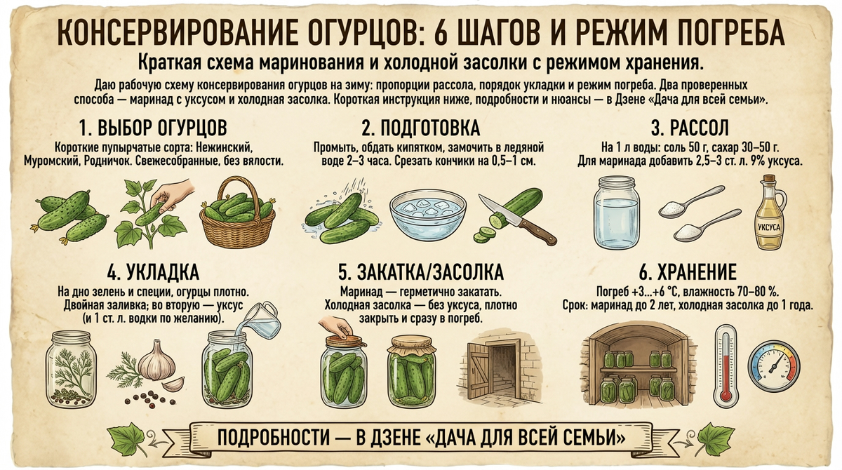 Небольшая «схема на пальцах» для ориентира. 1) Выберите подходящие огурцы (короткоплодные, свежесобранные). 2) Промойте, обдайте кипятком, замочите в ледяной воде на 2-3 часа, срежьте кончики. 3) Приготовьте рассол: на 1 л воды 50 г соли, 30-50 г сахара, для маринада — уксус 2,5-3 ст. л. 9 %. 4) Уложите зелень и огурцы, залейте горячим рассолом дважды, во вторую — уксус, при желании 1 ст. л. водки. 5) Закатайте, остудите, перенесите в погреб (+3…+6 °C, 70-80 % влажности). 6) Для холодной засолки используйте этот же солевой раствор, но без уксуса и без кипячения, храните только в погребе.