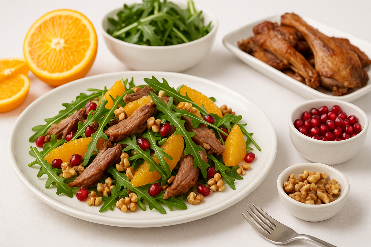 Обычно утка кажется чем-то сложным, но есть один способ превратить её в лёгкий и эффектный салат. Я вспоминаю, как впервые попробовала сочетание хрустящей кожицы, цитрусового сока и свежей рукколы. Это был тот самый момент, когда хочется сразу повторить всё дома. Расскажу коротко и по делу как приготовить порцию ресторанного уровня. Мини рецепт с красивой подачей Ингредиенты на 2 порции: Утка конфи 150 г Апельсин 1 шт Руккола 60 г Красный лук 20 г Грецкие орехи 15 г Заправка: оливковое масло 2 ч. л., бальзамический уксус 1 ч. л., мёд 0.5 ч. л., соль и перец Как приготовить: Снимите с утки кожу, мелко нарежьте и подсушите на сухой сковороде до хруста. Мясо разделайте вилкой на волокна. С апельсина снимите цедру, затем аккуратно отделите филе. Лук нарежьте тонкими лепестками, орехи слегка поджарьте. Смешайте масло, уксус и мёд. На тарелку выложите рукколу, сверху утку, апельсин, лук, орехи и хрустящую кожицу. Полейте заправкой. Подача лучше смотрится на белой тарелке: яркие дольк