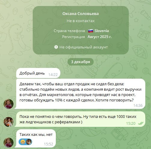 Аутрич «курильщика» или как делать не надо 😊 Поймали в личку классический спам-аутрич. Он, кстати, еще и денег стоит обычно. Даже в таком исполнении. В общем, давно про B2B не было, поехали 🚀 Быстро, что плохо: - незнакомый контакт + недавно зареган + другая страна; - «Добрый день» и тишина... Зачем на такое кому-то отвечать? - за счет чего рост выручки? 10% — это сколько в рублях? Как часто? Что не плохо: - краткость; - понятная боль «ОП бездельничает»; - и ненавязчивый CTA «Хотите поговорить?». Что важно: Собрали статью по поводу «Как надо» → https://nextgen-dc.ru/blog/outreach-guide Внутри статьи сервис по составлению аутрича. Пока бесплатный → Пользуем.
