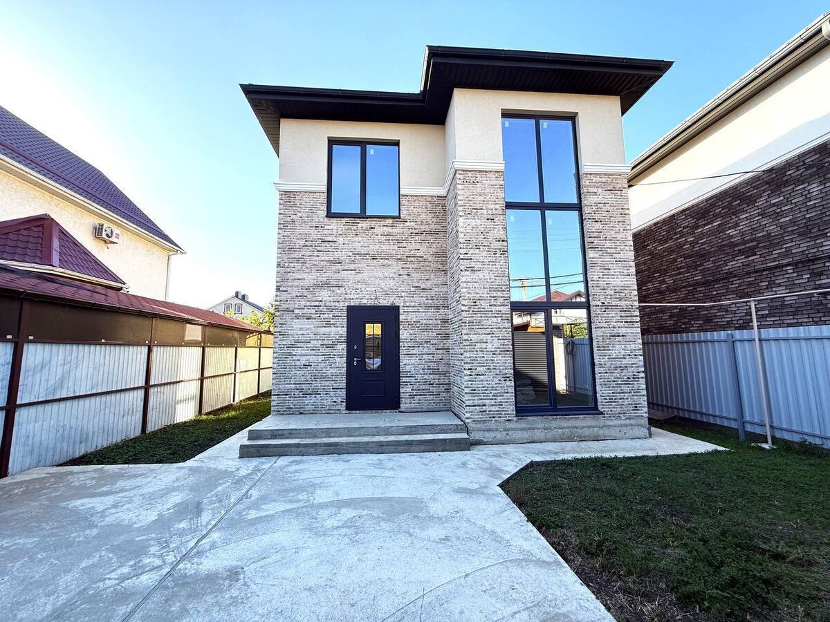 🔥🔥В ПРОДАЖЕ! 🏡Новый коттедж со всеми коммуникациями в отличной локации жизни в собственном доме в Краснодаре — микрорайон Сады Калинина/Ближний Западный обход 📍Дом расположен в районе улицы Троицкой. ❗️Улица тупиковая, тихая, подъездные пути полностью асфальтированная дорога. Район обжитой, все соседние дома заселены. ◾️Дом возведен в современном архитектурном стиле по индивидуальному проекту полностью из кирпича. ◾️Ленточный фундамент, внутренние стены — забутовочный кирпич, наружные — ригель ручной формовки Tonstein +декоративная штукатурка Ceresit с соблюдением всех строительных норм. Металлопластиковые панорамные энергосберегающие окна с внешней ламинацией, кровля — металлочерепица, качественная входная дверь с терморазрывом. ◾️Дом общей площадью 150 кв.м продуманной комфортной для проживания планировки: прихожая, холл, гостевая спальня с окнами в пол, санузел, кухня-гостиная 30 кв.м с выходом на задний двор, лестница на второй этаж монолитная — на первом этаже. ◾️Втор