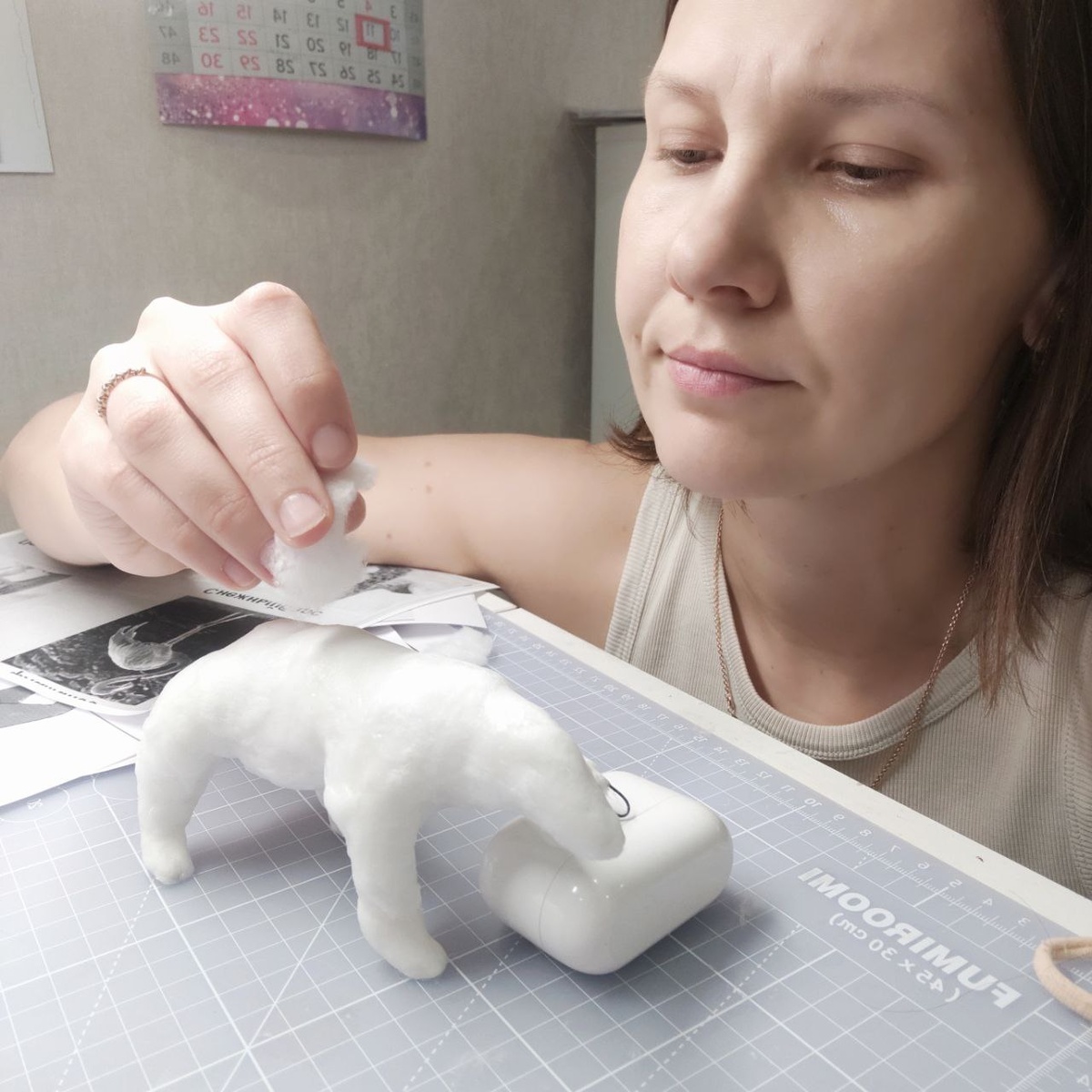 Поделюсь с вами готовой работой белого медведя из ваты, который у меня получился. Сначала искала фотографии,референсы настоящего белого медведя. Хотела сделать реалистичную фигуру с соблюдением всех пропорций. В Pinterest нашла фото со схемой каркаса. схемы в свободном доступе, можно сделать и бурого мишку так же Для каркаса использовала проволоку, размер такой же как на рисунке получился. Сложность конструкции в том,чтобы фигурка не заваливалась и не падала на один бок. Так как одна лапка поднята вверх. Далее на скелет наматываем вату и закрепляем белой ниткой. Далее завариваем клейстер, и начинаем наращивать объем фигурки. Далее оставила фигурку просохнуть, и начинаю делать мордочку. Медведя делала для конкурса "Животные Красной книги России", поэтому сделала вокруг мишки красную ленточку. Я ходожник и так вижу.) После того как фигурка высохла, раскрасила ленту,мордочку и немного туловище. Вот такая небольшая история о создании ватной елочной игрушки. Приходите дружить в