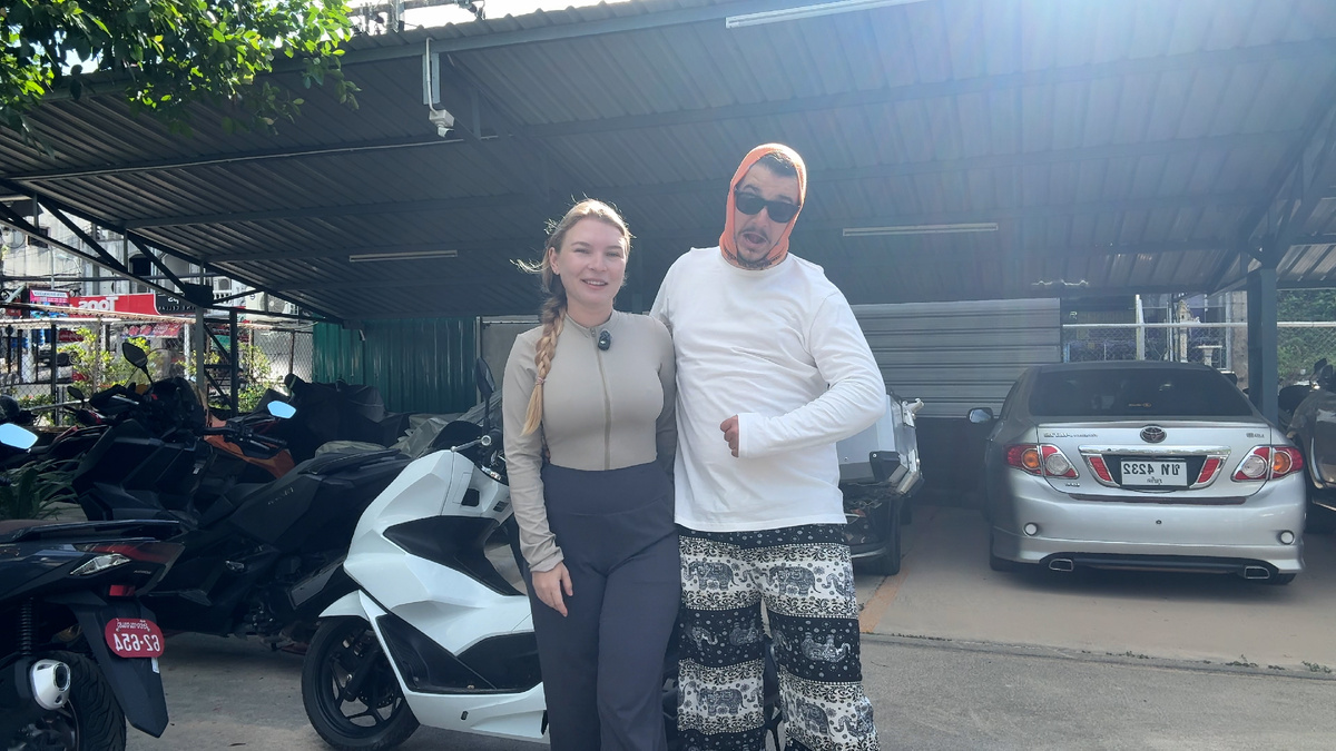 Утро стартовало с парковки нашего кондо. В Таиланде любая поездка на байке — это не просто «сел и поехал». Это сначала собрать весь нужный комплект вещей, попытаться утрамбовать их в багажник и под сиденье, а всё, что не влезет, — завязать, пристегнуть, закрепить, чтобы не улетело на первом же повороте.