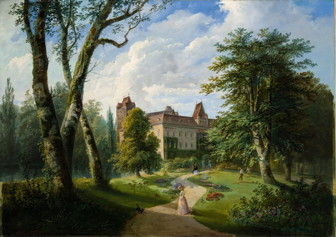 Австрийский художник Йозеф Альтенкопф (1818–1857) завоевал популярность среди венских ценителей искусства как живописец жанровых сцен и пейзажей. Пик его карьеры пришелся на 1855 год, когда князь Пал Анталь Эстерхази доверил ему управление своей картинной галереей и коллекцией гравюр. Однако его работа оказалась недолгой: он был арестован всего через восемнадцать месяцев, а затем приговорен к тюремному заключению за присвоение находившихся у него произведений искусства и продажу сорока картин и многочисленных ценных гравюр. Находясь на службе у князя, Альтенкопф написсал для него несколько картин, в том числе этот вид на замок Поттендорф, где Пал Анталь жил со своей семьей. В центре внимания здесь — романтический английский пейзажный сад на переднем плане. Замок Поттендорф, окруженный рекой Фиша, когда-то принадлежал несчастному графу Ференцу Надашди: именно отсюда его забрали в 1670 году , прежде чем казнить за участие в заговоре Весселеньи против императора Леопольда I. Приме