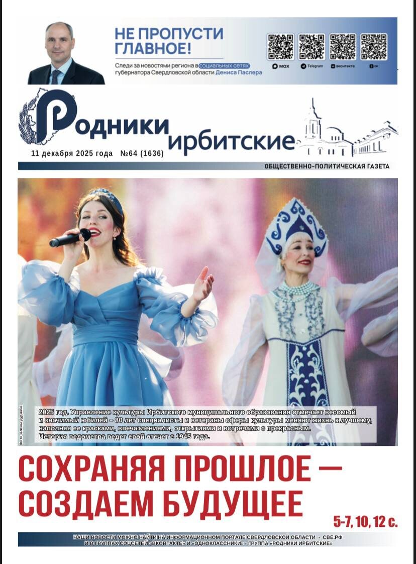 Новый выпуск газеты посвящен 80-летию Управления культуры Ирбитского муниципального образования. Специалисты и ветераны сферы культуры меняют жизнь района к лучшему, наполняя ее красками, впечатлениями, открытиями и встречами с прекрасным. История ведомства ведет свой отсчет с 1945 года. 📍Подписаться на канал «РИ»