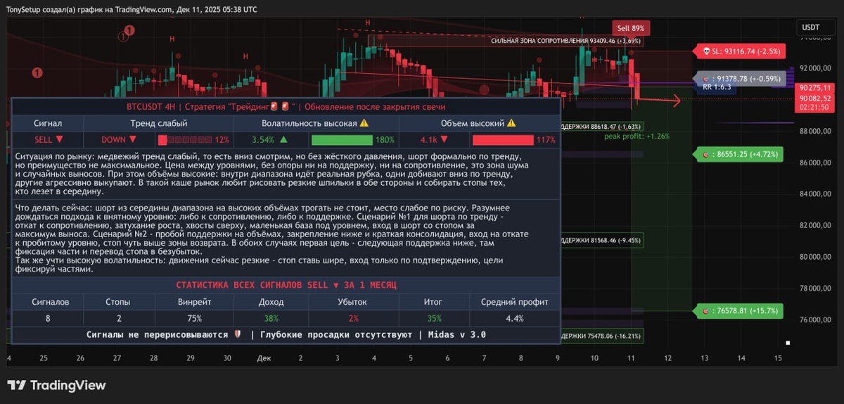 Утренний разбор BTC по Setup Master. Я вижу, что вчера BTC снова не смог удержаться над сильной зоной сопротивления 93 400 и ночью резким проливом сместился к 90 000. Сейчас торгуемся в нижней части диапазона под активным SELL-сигналом Setup Master, при высокой волатильности и объёмах - рынок выкидывает шпильки, собирая ликвидность между уровнями. Ключевая зона, от которой я строю сценарий на день, - сопротивление 91 400–93 400. Пока цена остаётся ниже 91 378 и уж тем более ниже стопа 93 116, для меня в силе медвежий вариант с целями по Setup Master в районе поддержки 88 600 и дальше к 86 551, 81 568 и 76 579. Бычий сценарий появится только при возврате и закреплении выше 93 116: тогда шорт-сетап ломается и давление продавцов существенно снижается. 👑Подключить индикатор
