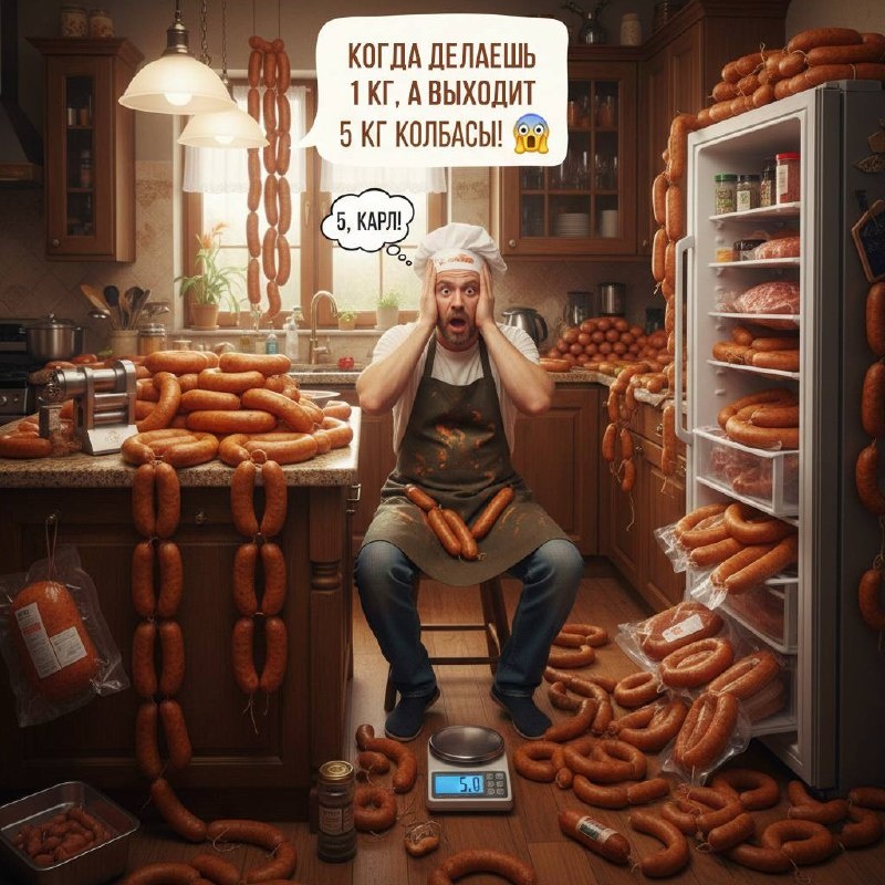 Когда делаешь 1 кг, а выходит 5! 😱 Насмотрелся видео с колбасой и решил, что пора и самому попробовать. Думаю: «Сейчас быстренько сделаю килограммчик домашней колбасы на ужин — просто, вкусно и без всяких проблем 🥩 » Начинаю готовить: мясо, специи, сало — всё по рецепту. Кручу фарш, набиваю оболочку, а колбасы становится всё больше и больше. Она, кажется, уже начала распространяться по всей квартире! 🤯 Вместо одного килограмма я получаю целых ПЯТЬ! ПЯТЬ! Что-то явно пошло не так… Видимо, я немного напутал с рецептурой, и теперь мой холодильник похож на склад колбасной фабрики! 😅 И вот, стою, думаю, что с этим всем делать… как вдруг — звонит будильник, и я просыпаюсь! 😅😅😅 Да уж, вот такие ужасы снятся ночью! Не забывайте читать граммовки, друзья! 😂 #домашняколбаса #колбасадома #рецептыколбасы #колбасник #prosto_kolbasa