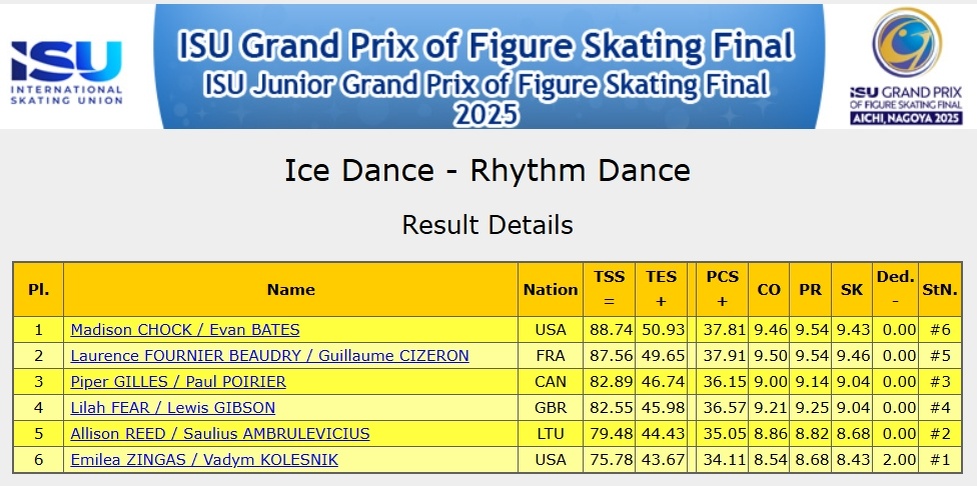 Американская пара Эмилия Зингас и Вадим Колесник тренируются вместе с 2022 года и они самые молодые в этой тусовке сильнейших (23 и 24 года). Пробились в финал впервые, тренируются под руководством Игоря Шпильбанда. Напомню, что темой ритм - танца в текущем сезоне является музыка 90-х. Оба в черном - у партнёрши чёрное, блестящее бюстье и микрошорты поверх чёрных колготок, дополняют образ хвостики с волнистыми волосами. Верх у партнёра - футболка с имитацией под кожу и простые чёрные брюки. Танец сам очень динамичный и фееричный, с дискотечным драйвом, как и положено молодежи. За дорожку шагов получили первый уровень, за вращательную поддержку - четвёртый. Штраф в 2 балла, итого - 75,78 балла и они шестые. Сразу за ними выступали литовцы Элисон Рид и Саулюс Амбрулявичюс. Тоже впервые попали в финал Гран - при. Тренируются они в самой известной ледовой академии в Монреале (Канада), сокращённо I. AM. Это частная организация, где совершенствуются танцоры со всего мира (если могут