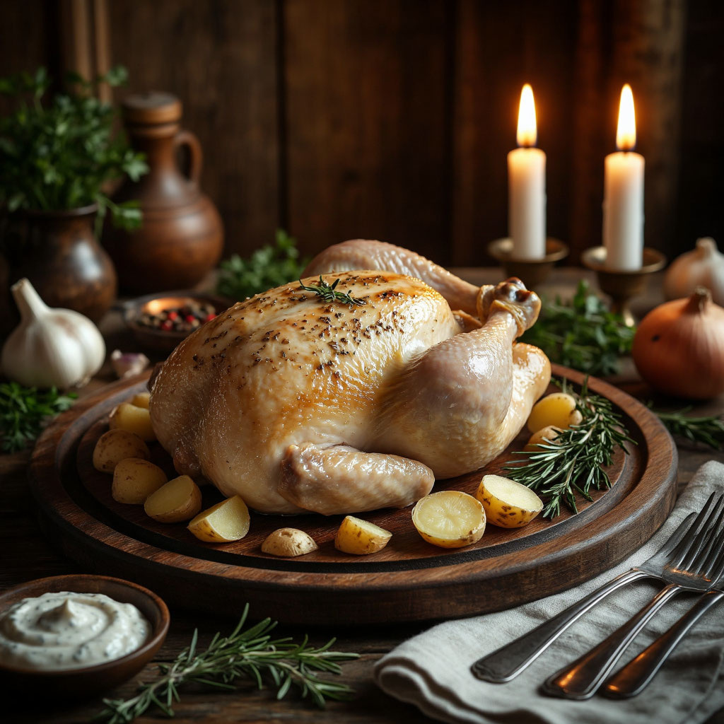 В старину курицу готовили совсем иначе, чем сейчас: без запекания до золотистой корочки, без маринадов и специй современной кухни. Основой был чистый вкус мяса, дополненный ароматами кореньев и острым, бодрящим соусом. Одно из таких блюд - отварная курица с хреном, которая когда-то считалась не просто едой, а настоящим лекарством для тела и души. Эта курица была обязательным гостем на столе в крестьянских семьях, в купеческих домах и даже в боярских палатах. И сегодня, когда мы ищем что-то натуральное, тёплое, домашнее - самое время вернуть этот рецепт в нашу кухню. Ингредиенты Курица (птица) - 1 тушка (1 кг) Бульон - 3 стакана Лимонный сок - 45 мл Хрен тёртый - 45 г Желток яичный - 2 шт. Сахар - 10 г Уксус - 10 мл Крахмал картофельный - 5 г Почему это блюдо стоило особого уважения Русские хозяйки верили: правильно сваренная курица способна вернуть силу уставшему человеку, помочь выздоравливающему и просто согреть душу.