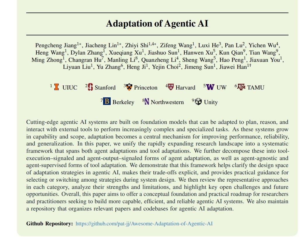 📘 Новая фундаментальная работа (65 страниц) от Stanford, Princeton, Harvard, University of Washington и других топ-университетов: впервые предлагается полная таксономия того, как современные агентные AI-системы адаптируются. Главная идея: Почти все сложные AI-агенты можно описать через всего 4 базовые типа адаптации - два связаны с обновлением самого агента, два других - с обновлением инструментов, которыми агент пользуется. Что такое агентный AI: Это большие модели, которые могут: - вызывать инструменты, - использовать память, - выполнять задачи в несколько шагов. Что такое адаптация: Любое изменение агента или его инструментов на основе обратной связи, от проверки кода до человеческих оценок. 4 вида адаптации: A1 - Agent Adaptation from Tool Execution Агент обновляется на основе того, что произошло при вызове инструментов: код запустился или упал, поиск что-то нашёл или нет. A2 — Agent Adaptation from Output Evaluation Агент обновляется по оценкам качества своих итоговых дейст