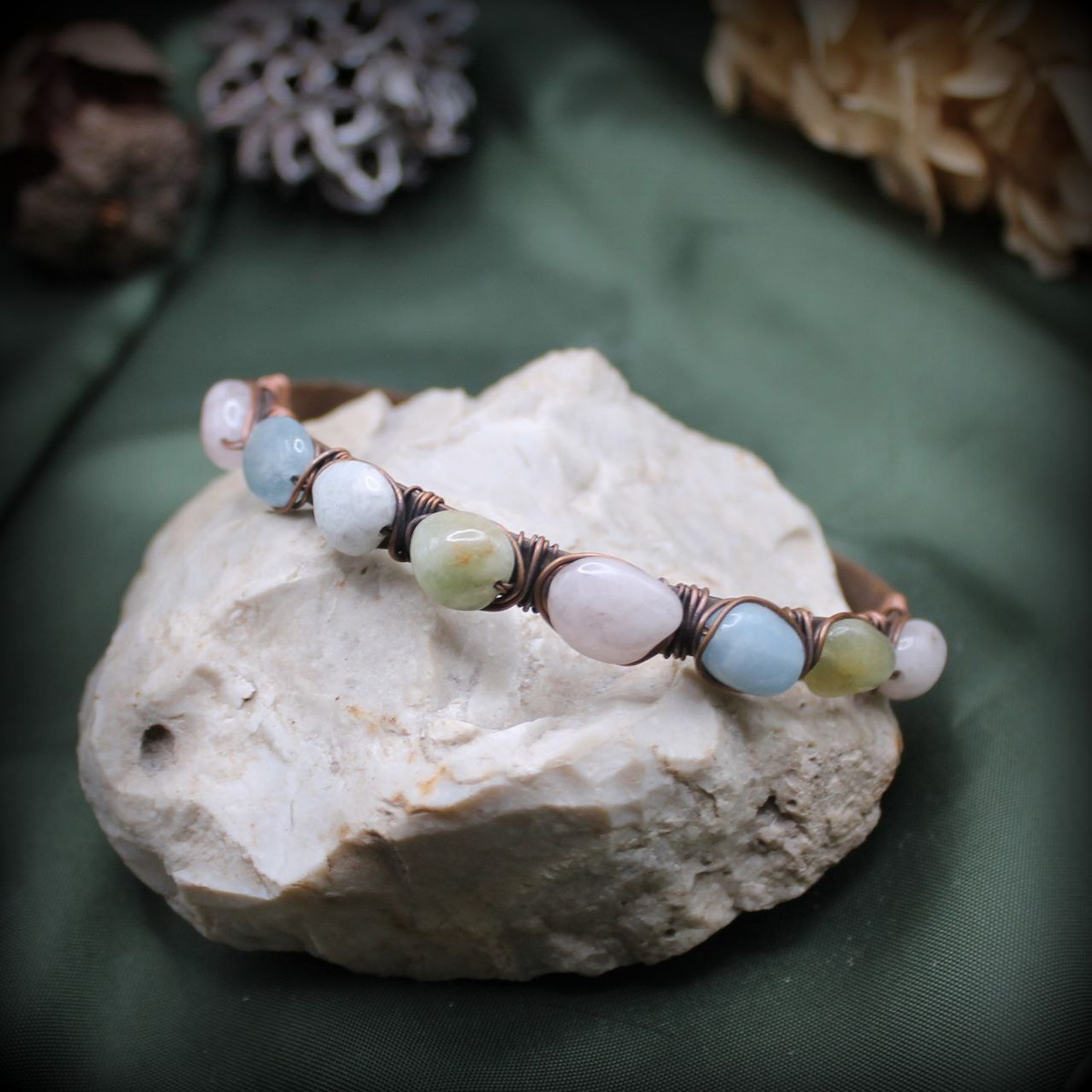 Браслет Нар-Хатият, с бериллом. Сидит Нар-Хатият, Великая Мать Неба, на вершине самой высокой горы. Утром, днем, ночью на мир смотрит, все видит. Рассветный туман собирает, и лучи звездные, и ветер с гор. Терпеливо, неспешно выглаживает в ладонях, создает небесные зерна. Да и отпускает их по ветру. Вырастет из одного такого зерна жаркое зеленое лето. А из другого - весенний заморозок. И весну, и зиму, и осень - все успевает посеять, все взойдет вовремя. -------------------------------------- Тонкий жесткий браслет из меди с полупрозрачными бериллами. Камни нежных пастельных оттенков голубого, розового, зеленого. Браслет безразмерный, концы разомкнуты и размер легко регулируется. Примерно, на руку обхватом до 21 см. Медь прокована для жесткости и покрыта патиной, а затем отшлифована, для проявления рисунка. #медныесказки #ручнаяработа #медныйбраслет #тонкийбраслет #жесткийбраслет #берилл #бохобраслет #браслетручнойработы #украшенияручнойработы