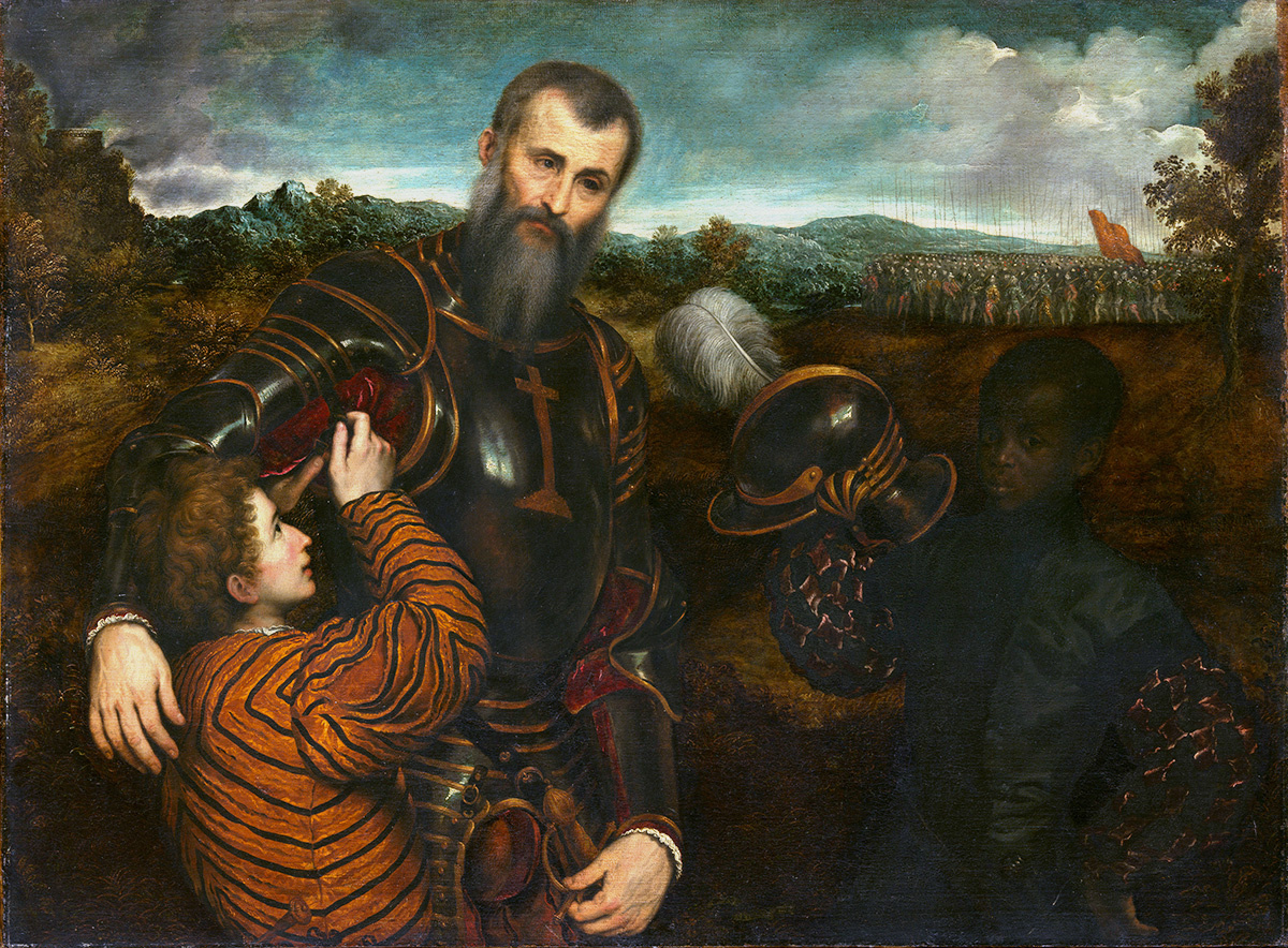На этом портрете в три четверти роста военный офицер стоит на фоне открытого пейзажа, в то время как паж в камзоле золотисто-коричневого цвета с чёрными полосками застегивает доспехи на правой руке, а чернокожий в блестящем черном камзоле держит открытый шлем. Все трое вооружены: офицер опирается левой рукой на рапиру, а у пажей на поясе висят кинжалы. На пейзаже справа пехотинцы маршируют вдоль горизонта, неся десятки пик и развернутое знамя. Серый дым поднимается из укрепленной башни слева. Возможно, это портрет работы Париса Бордона (1500-1571), принадлежал Бернардо Тринкавалле, коллекционеру произведений искусства, получившему венецианское гражданство в 1629 году. Картина Тринкаваллы была описана Карло Ридольфи в 1648 году как рыцарь, паж которого застегивает доспехи. Ридольфи не упоминает мавра, но и несколько современных авторов, описывавших эту картину, тоже этого не делают. Мавр действительно изображен на военном портрете работы Бордоне, который несколько позже принадлеж