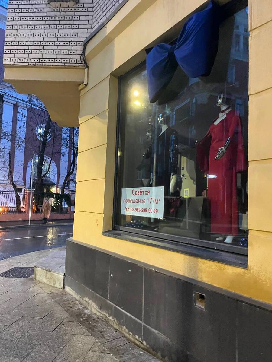 Магазин платьев на пересечении Трехпрудного и Козихинского закрылся. Не дотянул до корпоративов. Не сильно разбираемся в моде, но есть подозрение, что это не Dior. В очереди за такими фасонами стоять не будут. Говорят, магазин — амбиции жены состоятельного бизнесмена из Сибири. Ну хотя бы попробовали. Раньше в этом помещении был продуктовый «Бонжур», который продержался на удивление долго.