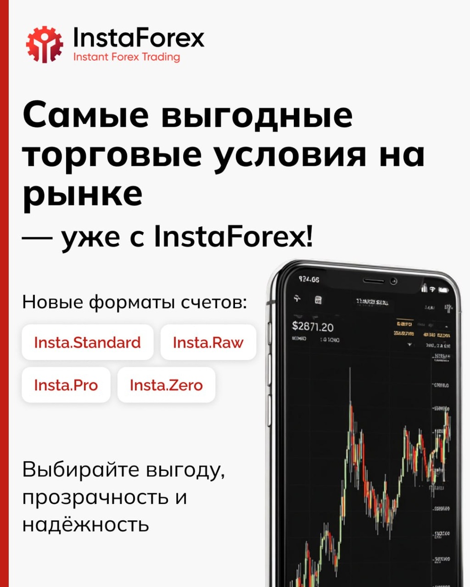 В октябре 2025 года компания InstaForex кардинально поменяла свои торговые условия, внедрив четыре типа счетов: Insta.Standard, Insta.Pro, Insta.Raw и Insta.Zero. Обновлённая линейка торговых счетов предоставляет трейдерам доступ к самым низким спредам и комиссиям на рынке. Цена входа в рынок с InstaForex на 30% ниже, чем у ближайших конкурентов. Торговля должна быть удобной и выгодной — вне зависимости от вашего опыта. Именно поэтому мы разработали новые типы счетов, в которых сочетаются минимальные издержки и гибкие условия как для новичков, так и для опытных трейдеров. Познакомьтесь с линейкой счетов InstaForex — выберите тот, что идеально подходит именно вам: https://ifxpr.com/44l4OqQ