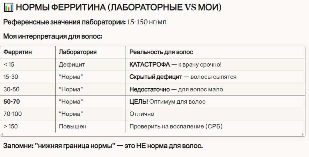 🩸 ЖЕЛЕЗО: ПОЛНЫЙ ГАЙД ПО ВЫБОРУ Как выбрать железо, чтобы оно реально работало (а не просто портило желудок) 70% моих пациенток с выпадением имеют низкий ферритин. Но 50% из них уже "пили железо" — и оно "не помогло". Почему? Потому что выбрали не ту форму. Разбираю все виды железа, конкретные бренды и как принимать, чтобы ферритин реально рос.🔴 ПОЧЕМУ ЖЕЛЕЗО — ЭТО ВАЖНО Начну с фактов. Моя статистика за 12 лет практики: Из 200 пациенток с выпадением волос: 78% имеют дефицит витамина D (ферритин < 30 нг/мл) 45% — тяжёлый дефицит (ферритин < 20) 23% — критический (ферритин < 10) Железо = топ-1 причина выпадения у женщин.Почему железо критично для волос: Железо = кислород Гемоглобин переносит кислород к фолликулам Нет железа → фолликулы "задыхаются" → переходят в фазу покоя → выпадение Железо = энергия Митохондрии в клетках фолликула работают на железе Нет железа → нет энергии для роста Железо = синтез ДНК Деление клеток в фолликуле требует железа Нет железа → рост замедляется