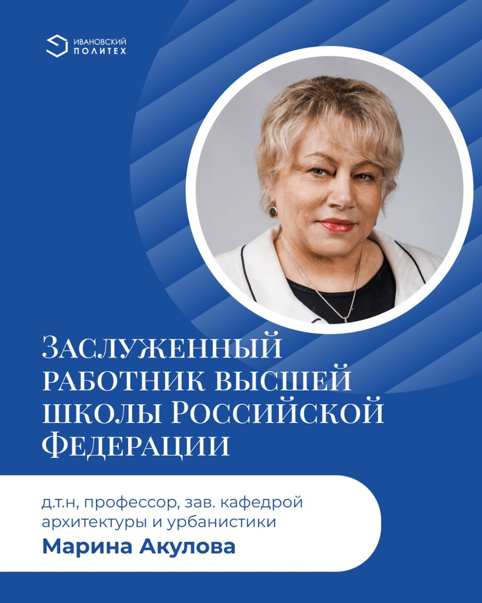 Заслуженная награда за профессионализм Указом Президента Российской Федерации от 10 декабря 2025 года «О награждении государственными наградами Российской Федерации» отмечены профессиональные успехи заведующей кафедрой архитектуры и урбанистики М.В. Акуловой. За заслуги в подготовке высококвалифицированных специалистов, научно-педагогической деятельности и многолетнюю добросовестную работу Марине Акуловой присвоено почетное звание «Заслуженный работник высшей школы Российской Федерации».