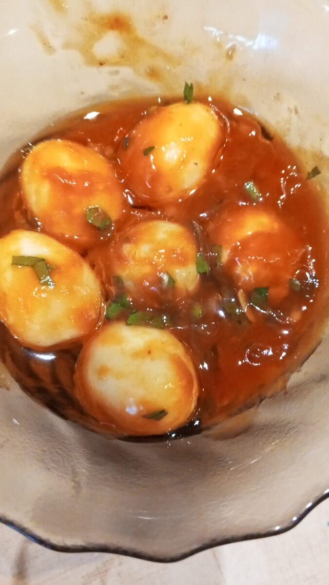 Яйцо перепелиное 20-30 шт Петрушка 1 пучок небольшой Чеснок 5-6 зубчиков Томатная паста 2 ст.л. Уксус 6% 2 ст.л. Соус острый 2 ст.л. Сахар 1 ст.л.без горки Соль 1 ч.л. Масло растительное 200 мл Измельчить петрушку и чеснок в блендере. Добавить томатную пасту, уксус,масло,соль,сахар и острый соус. Всё перемешать. Яйца отварить, охладить, очистить. Сложить в банку и соусом залить. На следующий день можно кушать, я снимал пробу уже через два часа. Вкуснота 👌 Соус можно кушать отдельно с хлебом или сливочным сыром Я только немного изменил. Масла налил меньше, 100 мл . И добавила 100 мл соевого соуса. Соли 1/2 ч. л.