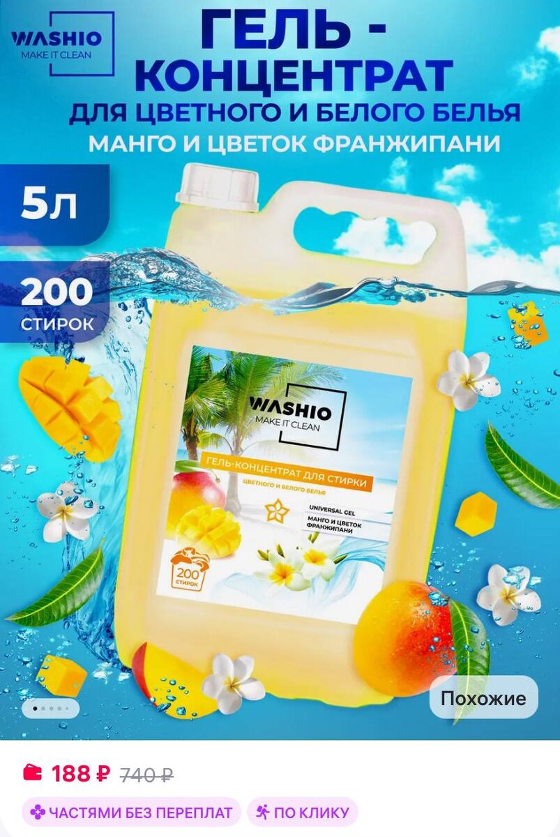 WASHIO Гель для стирки Манго и цветок франжипани 5 л https://www.wildberries.ru/catalog/255371530/detail.aspx?size=398100581 ✅ Подписаться 🔣 Бот с промокодами