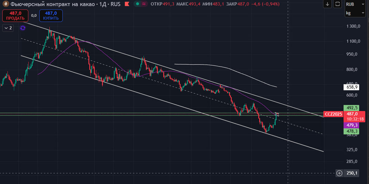 #КАКАО Предыдущий разбор можно посмотреть в навигации https://t.me/kv_na_taiti/5648 , цена идёт ровно по нему. Построили по Фибоначчи пять волн по тренду и сейчас идёт хорошая коррекция. ➡️На дневном графике цена идёт в канале на понижение. 🔼 От нижней стенки сформировалось разворотная фигура и целиком уже отработала. Верхняя стенка в канала 542, может туда дойти. ➡️На двухчасовом тайме мы видим, что цена немного остановилась после такого активного движения, возможно что-то будет строить. 😮 Пока ситуация неопределённая - нужно дождаться подтверждения движения вверх. Уровень сопротивления 492, два если пробьет и закрепится то поедет наверх. 👀 Открывать любые позиции в активе сейчас опасно,лучше торговать по движению рынка. Не является инвестиционной рекомендацией ⭐️В ВиП канале ежедневно торгуем. Подключайся @Kv_naTaItibot