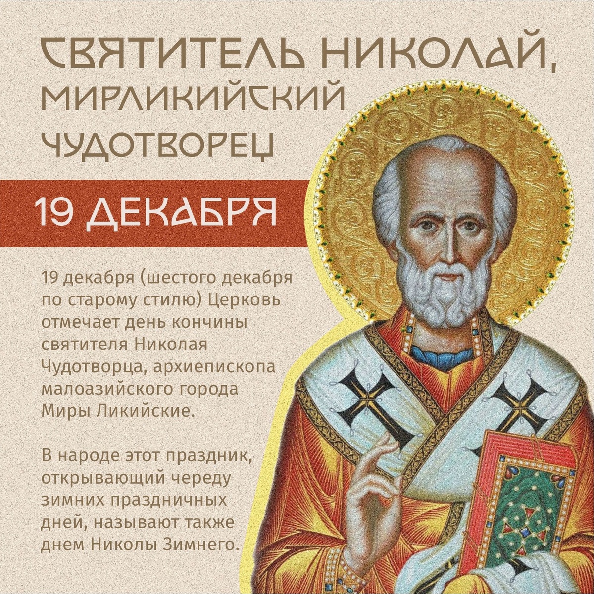19 декабря (6 декабря по старому стилю) Церковь отмечает день кончины святителя Николая Чудотворца, архиепископа малоазийского города Миры Ликийские. В народе этот праздник, открывающий череду зимних праздничных дней, называют также днем Николы Зимнего. Святитель Николай широко известен как заступник бедных, покровитель моряков и путешествующих. Письменные источники сохранили много сведений о совершенных им чудесах, продолжающихся до настоящего времени. Подробнее о празднике рассказали в карточках: