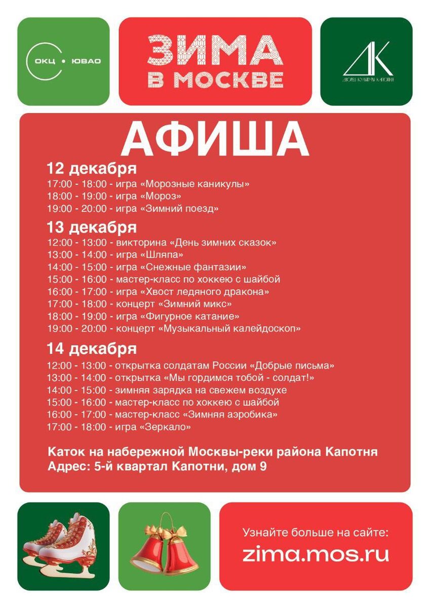 Дорогие друзья! С радостью сообщаем вам, что в рамках грандиозного проекта Мэра Москвы Сергея Семеновича Собянина "Зима в Москве" на нашем катке с 12 по 14 декабря вас ждут незабываемые дни, наполненные весельем и активностями. ❄️❄️❄️ Мы приготовили для вас насыщенную программу: будем играть в веселые игры, зажигательно танцевать под любимую музыку, а для тех, кто мечтает освоить хоккей, пройдут мастер-классы по забиванию шайб. И это далеко не всё! Вас ждут и другие увлекательные сюрпризы, которые не дадут скучать ни минуты.🎉 Не переживайте, если у вас нет своих коньков – на нашем катке работает удобный прокат, где вы сможете подобрать пару по размеру.☺️ Развлечения не ограничатся только ледовой площадкой! Игры и активности будут проходить и на прилегающей территории, так что каждый найдет себе занятие по душе. Приходите всей семьей, с друзьями, и окунитесь в атмосферу настоящего зимнего праздника!❄️❄️❄️ #ЗИМАВМОСКВЕ #МОСКВА #КАПОТНЯ #КЦКАПОТНЯ #ОКЦЮВАО