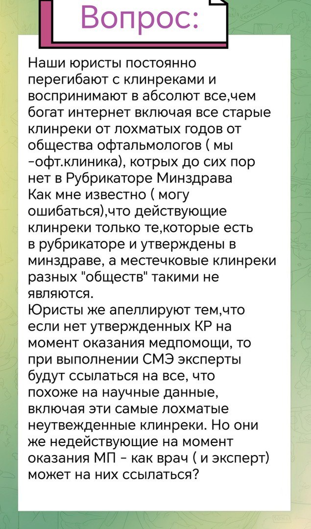 Старые клинические рекомендации (КР) в практике судебно-медицинской эксперта. Как мы к ним относимся и применяем? Хороший вопрос ко мне пришел через обратную связь канала, что я решила написать ответ публично. Думаю таким вопросом задаются многие Ответ вам не понравится Есть два острова, которые никак не наладят между собой сообщение Первый - медицинское сообщество, уперто повторяющее что "рекомендации" это от слова "рекомендательный" и потому они не могут быть обязательными. И оттого, на годы запаздывают с разработкой подзаконных актов, реестров, правил применения, процедуре утверждения этих самых КР. Нет проработки таких значимых вопросов как внесение изменений в КР, а ведь иногда там несуразные вещи пишут. Нет попыток разделить применение вот этого всего написанного в них на какие то уровни медицинских организаций, хотя понятно что некоторых видов исследований и анализов отродясь не было в небольших ЦРБ Второй - правоприменители, которые сначала внесли КР в 323-фз и далее им п