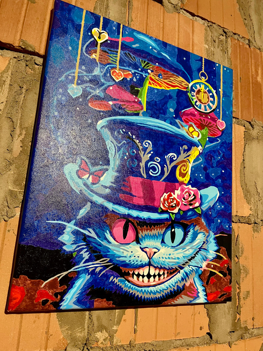 Приветствую, друзья мои и случайные гости! Сегодня поделюсь немного своими эмм… увлечениями…развлечениями… не знаю, как назвать. Иногда у всех нас появляется появляется потребность побыть наедине с собой, своими мыслями, просто отвлечься от суеты, ненадолго остановиться. Я в такие моменты категорически не могу просто сидеть ничего на делать. Для этого у меня в запасе всегда есть наборы для раскрашивания картин по номерам, вышивки крестиком или что-нибудь подобное. Недавно закончила вот такого милого Чеширского котика. В конце ещё и покрыла его светящейся краской, теперь он и ночью улыбается нам. Красила наскоками , летом вообще забросила, поэтому от начала до конца работы примерно семь месяцев. Чеширский кот вообще один из моих любимых литературных персонажей. А тут ещё и картинка такая яркая, в дерзких кислотных тонах, поэтому с удовольствием его раскрашивала. Разместила его у нас в спальне. За зиму надеюсь раскрасить ещё козу (как же без коз) на фоне гор, тоже покажу потом