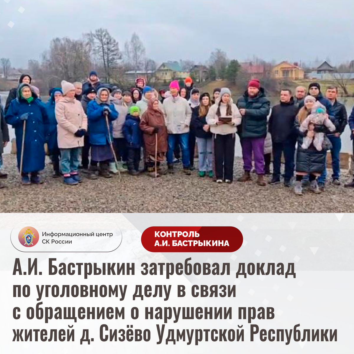 А.И. Бастрыкин затребовал доклад по уголовному делу в связи с обращением о нарушении прав жителей д. Сизёво Удмуртской Республики В сети Интернет размещено видеообращение жителей деревни Сизёво Удмуртской Республики по вопросу нарушения их прав. Ранее земли сельскохозяйственного назначения переведены в категорию зоны мест погребения. Граждане опасаются, что размещение кладбищ и крематория повлечет ухудшение экологической обстановки и загрязнение подземных вод, а в ходе строительства объектов будет осушен водоем, используемый как источник водозабора. Обращения в компетентные органы результатов не принесли. В СУ СК России по Удмуртской Республике возбуждено уголовное дело. Председатель Следственного комитета Российской Федерации Александр Иванович Бастрыкин затребовал у руководителя СУ СК России по Удмуртской Республике Рустама Рашидовича Тугушева доклад о ходе и результатах расследования уголовного дела. Исполнение поручения поставлено на контроль в центральном аппарате ведомства. #Сле