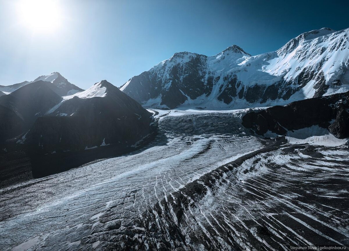 Аккемский ледник — это динамичная, живая и изменчивая система льда у подножия Белухи. Чтобы лучше понять его структуру, взгляните на следующую схему, которая показывает ключевые элементы ледника и их взаимосвязь: ❄️ Подробнее о структуре ледника В представленной схеме показаны основные составляющие ледника: Зона питания — это высокогорный цирк (снежно-фирновая чаша) у подножья знаменитой Аккемской стены Белухи. Снег, накопившийся здесь за сотни лет, спрессовывается в лёд под собственным весом и начинает своё движение вниз. Ледопад — критически опасная зона, где ледник "срывается" со ступени цирка. Лёд здесь разламывается на глыбы, образуя хаотичное нагромождение глубоких трещин и ледовых башен (сераков). Это непреодолимое препятствие, которое альпинисты, идущие на Белуху, обходят по морене (скоплению камней по бокам ледника). Трещины и ледовые потоки — ниже ледопада ледник выравнивается, но движение льда продолжается, образуя характерную сеть трещин. Именно эти разломы и создают то