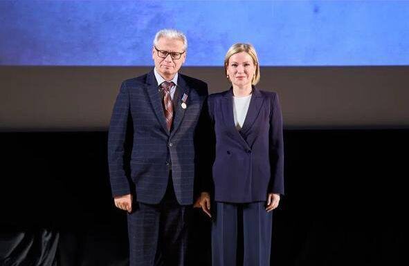 👏 Медаль Александра Твардовского вручили председателю Союза художников РСО-А Таймуразу Маргиеву. Почетную награду вручила министр культуры РФ Ольга Любимова. Всего во время церемонии медалью наградили 35 деятелей культуры, сообщает министр культуры Северной Осетии Батраз Гудиев. Отметим, что медаль Александра Твардовского была учреждена в 2025 году. Она присуждается деятелям культуры, искусства и креативных индустрий, работающим в условиях боевых действий или при других обстоятельствах, сопряженных с риском для жизни. 📰 Вести Алания | Владикавказ