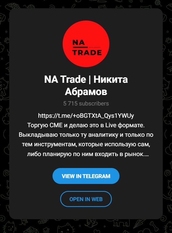 По легенде, Никита занимается трейдингом более 5 лет, а последние 3 года якобы живёт только за счёт торговли. Канал NikitaAbramovTrade стартовал в 2024 году, причём отмечается, что до этого его, судя по истории, использовали под другой проект и просто «перекупили» для перезапуска под бренд NA Trade.