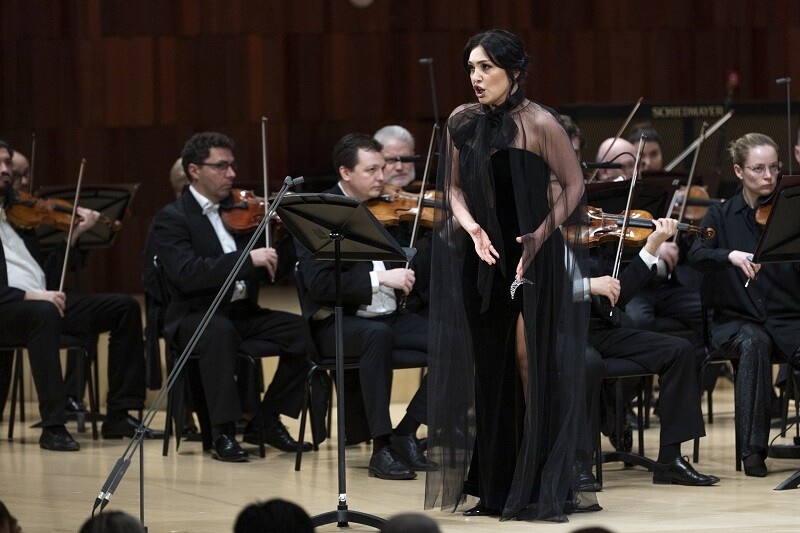 Западное отделение было подобрано артисткой идеально: прозвучала та музыка, которая лучше всего подходит ее сегодняшнему голосу – бельканто и французский лирический репертуар. Красивый инструмент Мхитарян обладает бесценными качествами для оперы бельканто – чарующим тембром, гибкостью в голосоведении, элегантностью в выпевании украшений; при этом голос не относится к легким, в звуке чувствуется плотность и насыщенность, низы озвучены и окрашены убедительно. Все это очень хорошо, с одной стороны, для прозрачной белькантовой фактуры – что вокального письма, что оркестрового, – с другой – для часто патетических ролей этого стилевого направления, особенно в операх так называемого драматического бельканто.