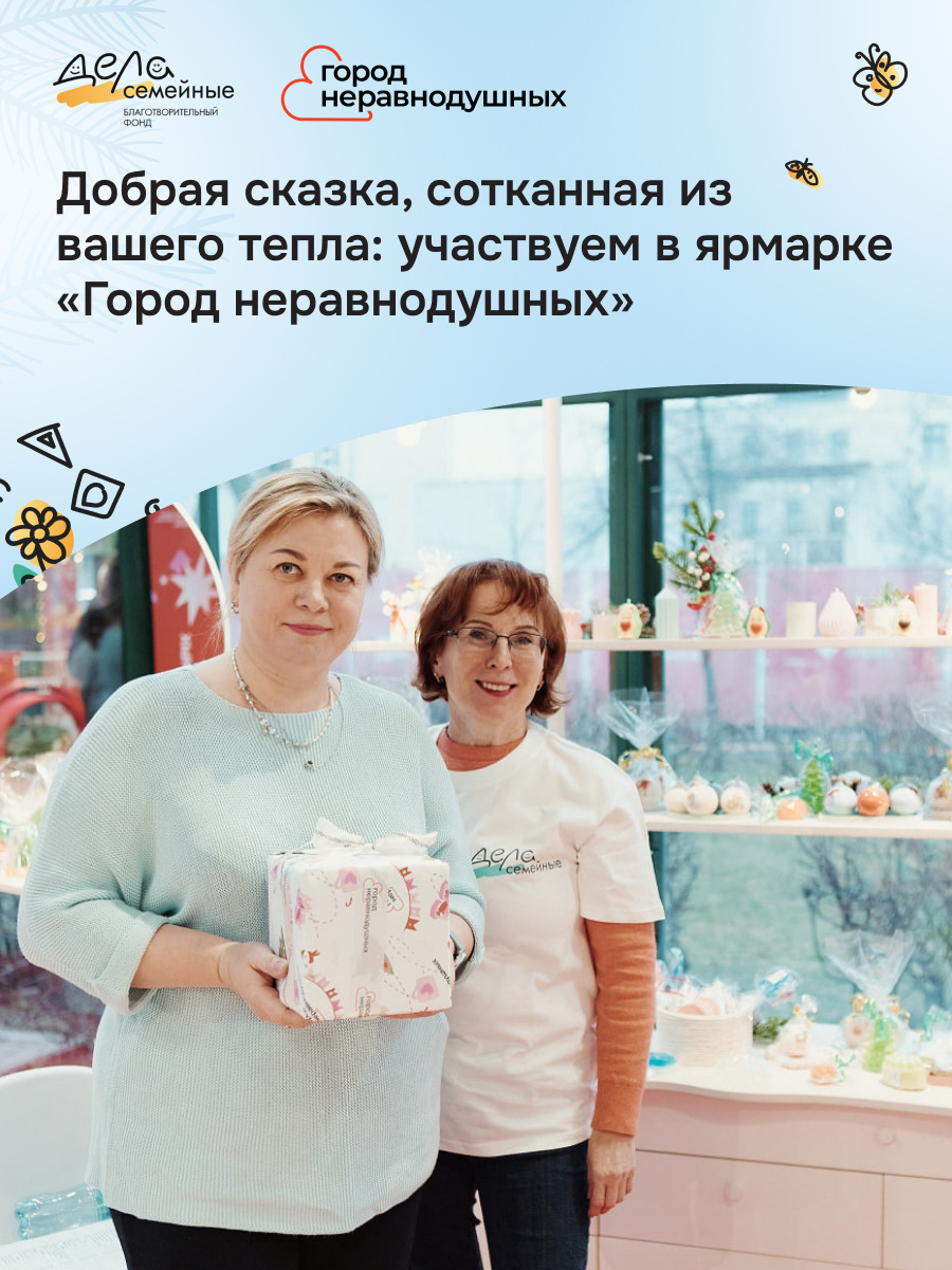6 декабря фонд «Дела Семейные» принял участие в благотворительном фестивале «Город неравнодушных», который проходил на Болотной площади в Москве. Это событие объединило НКО, социальные проекты и инициативы на одной площадке, предоставив настоящий «шведский стол» добрых дел для желающих помочь Все собранные на ярмарке средства мы направим на системную помощь подопечным. Благодарим организаторов события и говорим отдельное спасибо нашим коллегам из других некоммерческих организаций — за вдохновляющий обмен опытом и живое общение! Для тех, кто хотел присутствовать на ярмарке, но не смог, сделать доброе дело можно здесь