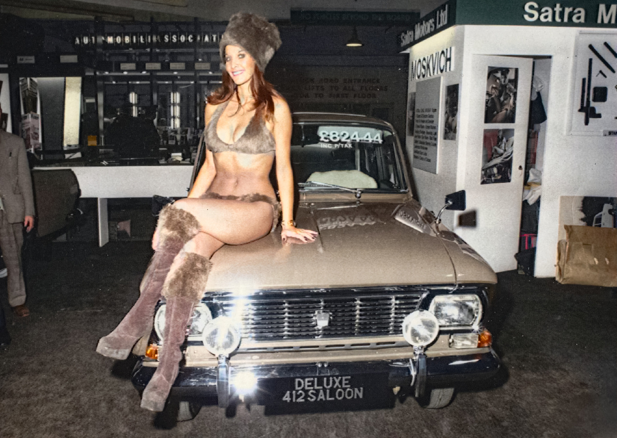Moskvich 412 Saloon Deluxe демонстрируется в максимально укомплектованной версии: с фирменными зеркалами заднего вида на крыльях, «противоподкатными» клыками на бампере, противотуманными фарами и даже меховыми чехлами на передних сиденьях.