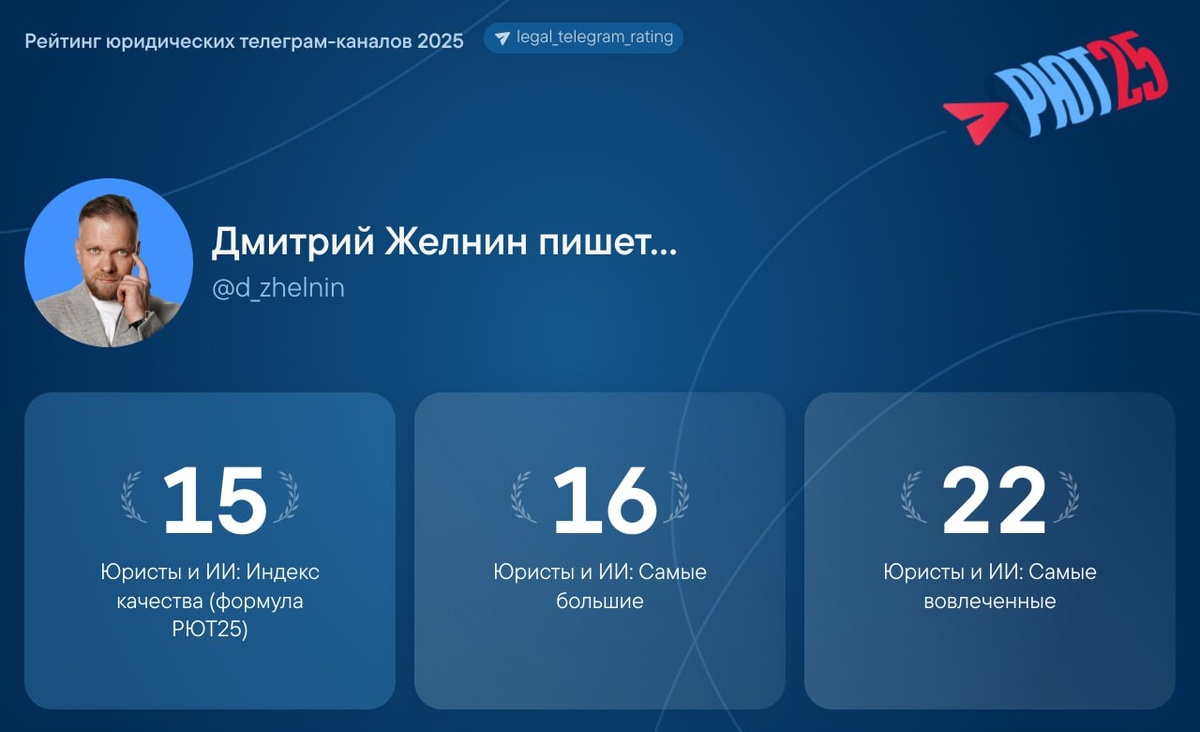 🔥 Немного хвастовства вперемешку с благодарностью Мой телеграм-уголок неожиданно попал в рейтинг юридических каналов-2025 🤷♂️ По общей сетке я где-то в середине поля, но в профильных категориях уже повеселее: ☝️ по налогам: 42 место по размеру, 31 по «индексу качества», ☝️ по теме «юристы и ИИ»: 16, 15 и 22 места в разных номинациях. Для камерного канала про налоги на недвижимость, суды и нейросети это прям очень неплохо 😊 Спасибо всем, кто читает, спорит, пишет комменты и делится постами. Рейтинги ради рейтингов мне не особенно интересны, но как обратная связь: значит, двигаемся куда надо 💪 Если хотите помочь каналу забраться повыше в следующем году: просто кидайте ссылку коллегам и друзьям, которым пригодятся налоги, кадастр и ИИ 😉.