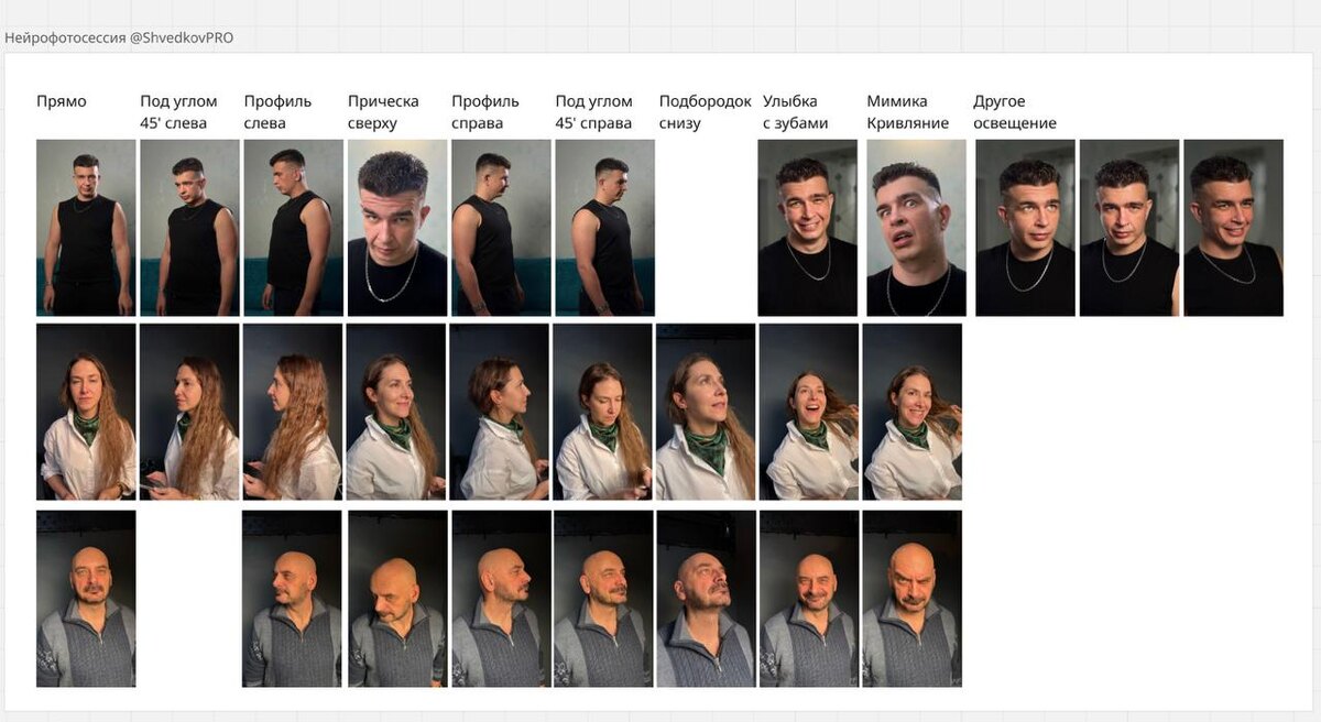 РЕФЕРЕНС для НЕЙРОФОТОСЕССИИ Для фоточек с вашим лицом Подготовил для вас пример дополнительных фото, которые нужно сделать для обучения нейросети (LoRA). Low-Rank Adaptation - это метод дообучения большой нейросети небольшим дополнительным модулем, вместо того чтобы переучивать всю модель с нуля. Такой модуль весит мало, быстро обучается и как бы «подкручивает» поведение основной модели под конкретного человека или стиль. Помимо этих кадров, еще соберите 20 старых фото на которых хорошо видно ваше лицо и без посторонних персонажей (в целом даже селфи подойдут). Как сделать себе нейрофотосессию рассказывал в этом видео: https://vkvideo.ru/video-226991951_456239179 🔖 Cохраняем в закладки @ShvedkovPRO