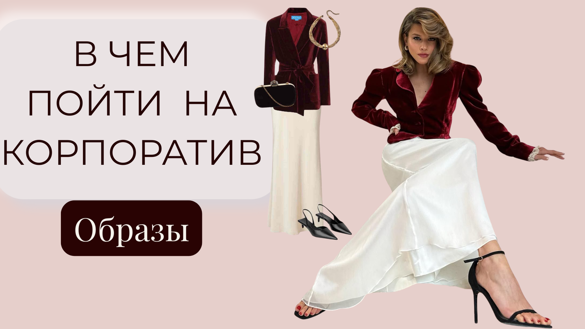 Корпоратив — это тот самый вечер, когда можно быть ярче, смелее и эффектнее обычного. Но вот проблема: «формат» непонятный, дресс-код никто не объявил, и кажется, что надеть вроде бы всё можно, но ничего конкретного не подходит. Чтобы избавить тебя от мук выбора, я собрала готовые капсулы — праздничные, современные и очень разные по настроению. Выбирай ту, в которой твоя личность зазвучит громче всего. 1. Брючный образ с серыми палаццо, чёрным топом и красными перчатками Этот образ — идеальный вариант для тех, кто любит строгую базу, но хочет добавить в неё каплю драмы. Широкие серые брюки создают элегантный силуэт, а блестящий чёрный топ делает ансамбль вечерним. Длинные бархатные перчатки винного оттенка — главный акцент, который превращает образ в по-настоящему праздничный. Миниатюрная сумочка и чёрные мюли завершают наряд. 2. Атласное платье в шампань с белым жакетом Нежный, изысканный образ для торжества в классическом стиле. Платье струится по фигуре и красиво ловит свет
