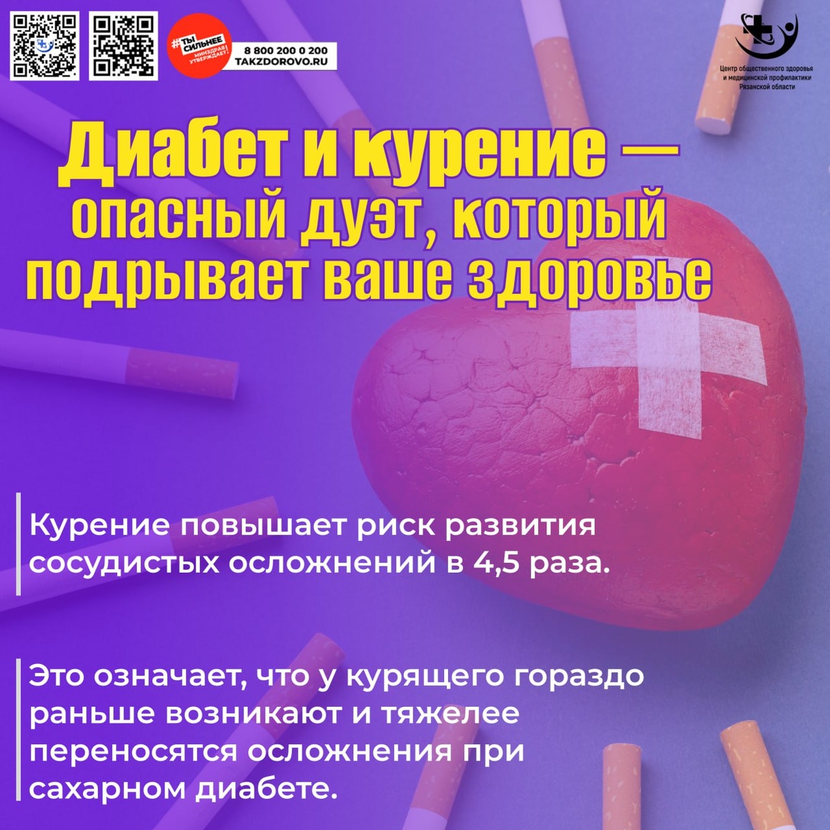 Диабет + Курение = Опасное сочетание Для людей с диабетом курение — не привычка, а множитель рисков, ускоряющий осложнения. Почему это критично? 🩸 Сосуды под двойным ударом: Диабет повреждает, никотин сужает. Риск инфаркта, инсульта, проблем с ногами — возрастает в разы. 🦶 Высокий риск ампутации: Нарушение кровотока + диабет = серьёзная угроза синдрома диабетической стопы. 👁 Ускоренная потеря зрения: Диабетическая ретинопатия прогрессирует намного быстрее. 💊 Сахар выходит из-под контроля: Курение повышает глюкозу и инсулинорезистентность. Отказ от курения — жизненно важен для управления диабетом. Первый шаг: звонок на горячую линию 8-800-200-0-200 или визит к врачу. Защитите своё здоровье. Выберите жизнь без никотина. #Диабет #Курение #НетНикотину #ЗдоровоеБудущее62 #ЗдороваяРязань