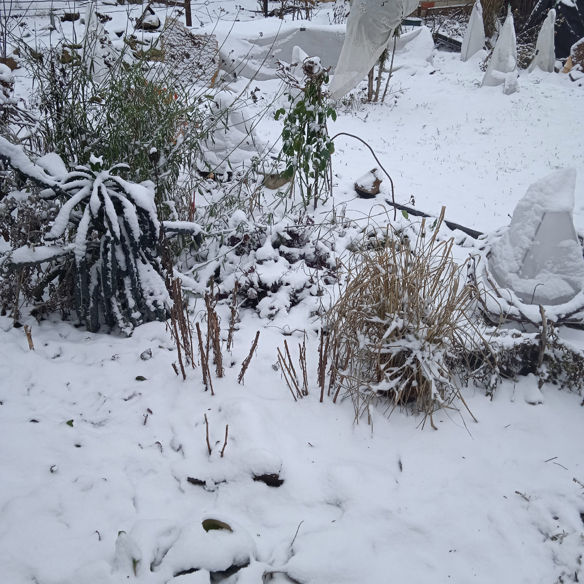 Вот такая зима мне очень даже нравится! Да, не всегда зима и снег приходят вместе. Только вчера, было все серо и уныло, а нынче, та же картинка выглядит иначе. Сегодня проснулась среди ночи, открыла глаза, светло. Ну, думаю, пора вставать, утро настало. Посмотрела на часы, а там 2.35. Вот что делает снег! Хоть я зиму и не люблю, но раз это неизбежно, то я бы хотела, чтобы вся зима была такой. Только бы снежку немного привалило. Морозец совсем небольшой, земля талая. Но, увы! В ночь обещают -10. Всё , что считала нужным укрыто, остальное, думаю , переживет. Ну, а не переживет, новых насадим! Всё больше и больше становлюсь пофигисткой. В этом году большой урожай на шишки сумаха. Если будет все нормально, весной ими замульчирую гортензии. Они подкислят почву. Не стала в этом году и с тарелками таскаться. Уж очень они тяжелые. Одну, молодую накрыла ковриком, как и в прошлом году, а эту оставила открытой. Если вымерзнет, недолго новую создать. Она все равно сильно разрослась и я хоте