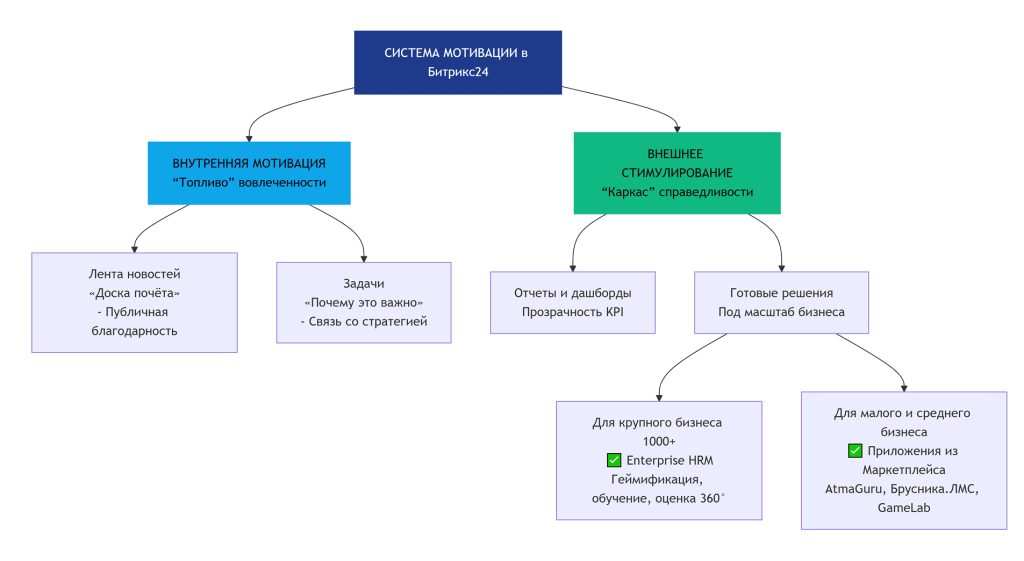 Проблема: Даже самая продуманная стратегия обречена на провал, если у команды нет внутренней энергии на ее выполнение. Внешнее стимулирование (KPI и премии) работает, но до определенного предела. Задача руководителя в Битрикс24 — создать систему постоянного признания и мотивации, которая превратит рутину в осмысленную деятельность.