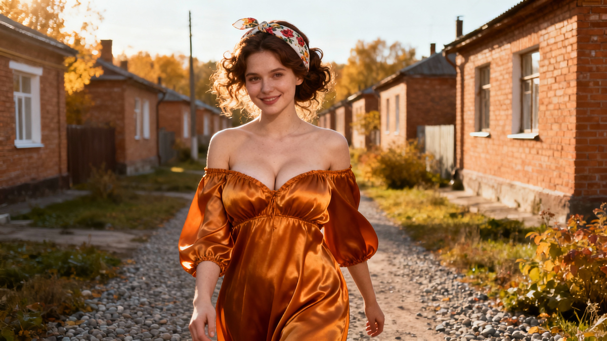 Вера кормила кур во дворе, её лицо сияло от радости простого труда, без макияжа для блеска. В глазах отражалась доброта, которая делала черты мягче и привлекательнее. Её волосы были заплетены просто, без спреев, подчёркивая естественную красоту. Кожа её была загорелой от солнца, без тонального крема. Эта красота была живой, как утро в деревне, полное свежести.