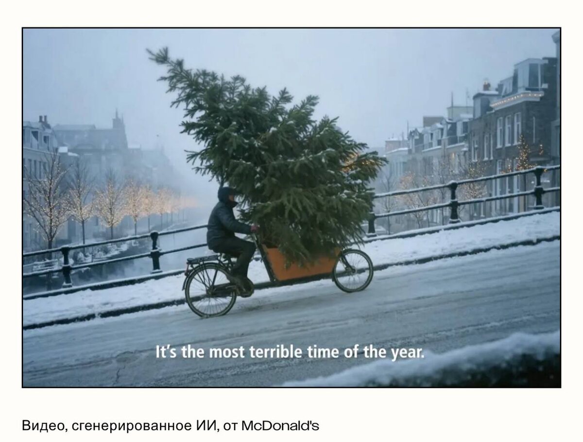 /Futurism/. Хотя рекламный ролик набрал всего 20 000 просмотров на YouTube, негативная реакция в комментариях была настолько сильной, что McDonald's отключил комментарии на выходных, а затем и вовсе удалил видео. Весь ролик построен на ИИ и исходит из тезиса о том, что праздничный сезон — это «самое ужасное время года».