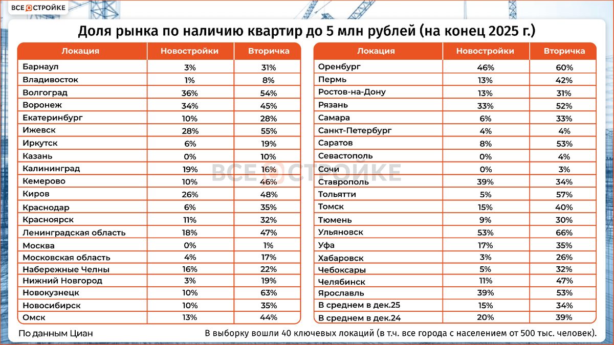 В России ещё осталось жильё до 5 млн рублей: доля таких лотов в новостройках составляет 15%, а во вторичке — 34%