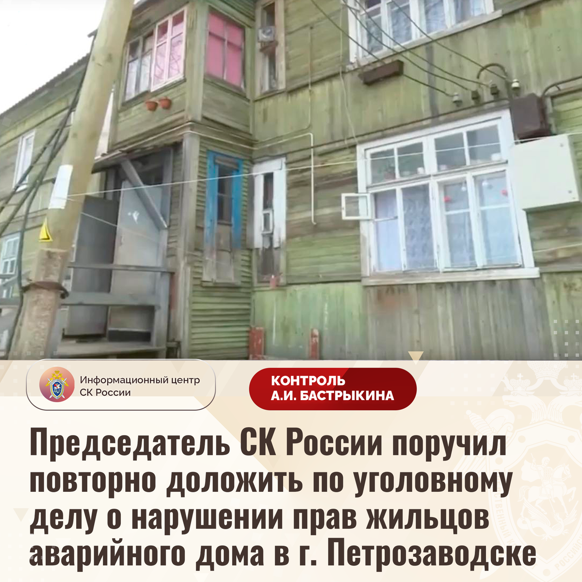 Председатель СК России поручил повторно доложить по уголовному делу о нарушении прав жильцов аварийного дома в г. Петрозаводске В комментариях в аккаунте приёмной Председателя СК России А.И. Бастрыкина «ВКонтакте» размещено обращение по вопросу несогласия с ходом установления обстоятельств нарушения прав жильцов многоквартирного дома на улице Птицефабрика города Петрозаводска. Длительное время кровля здания 1932 года постройки повреждена и протекает, межэтажные перекрытия деформированы, конструкции разрушаются, коммуникационные системы изношены. Несмотря на признание строения аварийным в 2017 году, благоустроенное жилье гражданам не предоставлено. Многочисленные обращения в различные инстанции результатов не принесли, до настоящего времени проблема не разрешена, никто к ответственности не привлечен. Ранее указанная ситуация освещалась в социальной сети. В СУ СК России по Республике Карелии расследуется уголовное дело, по которому ранее А.И. Бастрыкин поручал представить доклад. Предсе