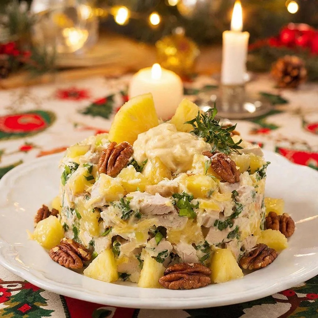 Этот салат — прекрасное сочетание нежного мяса, сладковатых ананасов, пикантного сыра и хрустящих орехов. Он получается сытным, но при этом свежим благодаря зелени. Идеально подходит как для праздничного стола, так и для повседневного ужина. Ингредиенты · Филе грудки индейки: 300-400 г · Консервированные ананасы (кольцами или кубиками): 1 банка (около 500 г) · Твердый сыр (российский, гауда, чеддер): 150 г · Грецкие орехи: 70-100 г · Свежая зелень: пучок (укроп, петрушка, зеленый лук) · Для заправки: · Майонез или сметана: 3-4 ст. ложки (по вкусу) · Соль: по вкусу · Черный молотый перец: по вкусу · Для приготовления грудки (опционально): · Соль, перец, специи для птицы · 1 ст. ложка растительного масла Пошаговый рецепт приготовления 1. Приготовление индейки · Промойте грудку индейки и обсушите бумажным полотенцем. · При желании натрите специями и солью. · Разогрейте на сковороде масло и обжарьте грудку с обеих сторон до золотистой корочки (около 5-7 минут с каждой стороны).