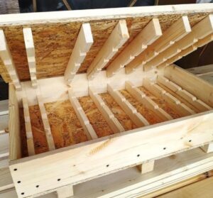 Ложемент в деревянном ящике из ОСП. В качестве основного материала использовалась плита ОСБ 9 мм. Пол выполнен из доски 25 мм, полоз — из бруса 100х100. С каждой стороны были установлены деревянные ручки для удобного перемещения ящика. Изображение: szpk78.ru